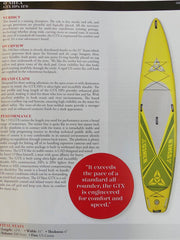 "The ride is dry, steady and safe and storage provisions are plentiful and logically placed. All the necessary attachments are included for multi-day expeditions (towing, portage, anchoring) whether along wide, curving rivers or coastal runs. It exceeds the pace of a standard all-rounder. It is engineered for comfort and speed. A true adventurer's board" (Note that the article refers to this 13' board as a GTX, whereas it is the GTE!)